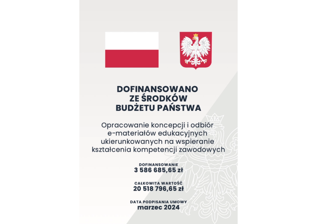 - Opracowanie, w ramach koncepcji, standardów technicznych e-materiałów edukacyjnych ukierunkowanych na wspieranie kształcenia kompetencji zawodowych, w tym standardu dostępności WCAG oraz standardu funkcjonalnego.