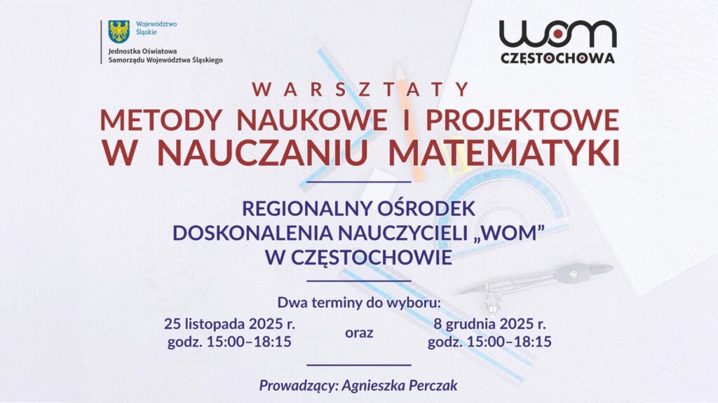 Zapraszamy nauczycieli matematyki z województwa śląskiego na warsztaty stacjonarne w Regionalnym Ośrodku Doskonalenia Nauczycieli „WOM” w Częstochowie. Podczas zajęć na temat „Metody naukowe i projektowe w nauczaniu matematyki” uczestnicy dowiedzą się, jak wykorzystać w swojej pracy nowoczesne strategie nauczania. Poznają także praktyczne sposoby planowania angażujących lekcji, organizowania pracy zespołowej i rozwijania postawy badawczej uczniów.