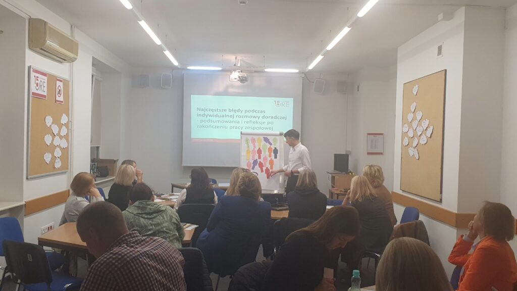 W kolejnym bloku trener zaprezentował etapy rozmowy doradczej oraz wybrane metody i techniki jej prowadzenia. Omówił szczegółowo sztukę zadawania pytań i informacji zwrotnej podczas rozmowy doradczej zarówno z uczniem szkoły podstawowej, jak i ponadpodstawowej, ponieważ na obu poziomach wygląda ona trochę inaczej. Zauważył, że także doradcy zawodowi popełniają błędy podczas indywidualnych rozmów doradczych z uczniami. Zapewnił jednak, że można je zminimalizować lub w ogóle ich uniknąć dzięki stosowaniu odpowiednich metod i technik. Właśnie tego tematu dotyczył kolejny punkt programu. Uczestnicy mieli okazję podzielić się własnymi doświadczeniami: opisać sytuacje, z którymi zetknęli się w swojej pracy, i pokazać, jakie rozwiązania zastosowali.