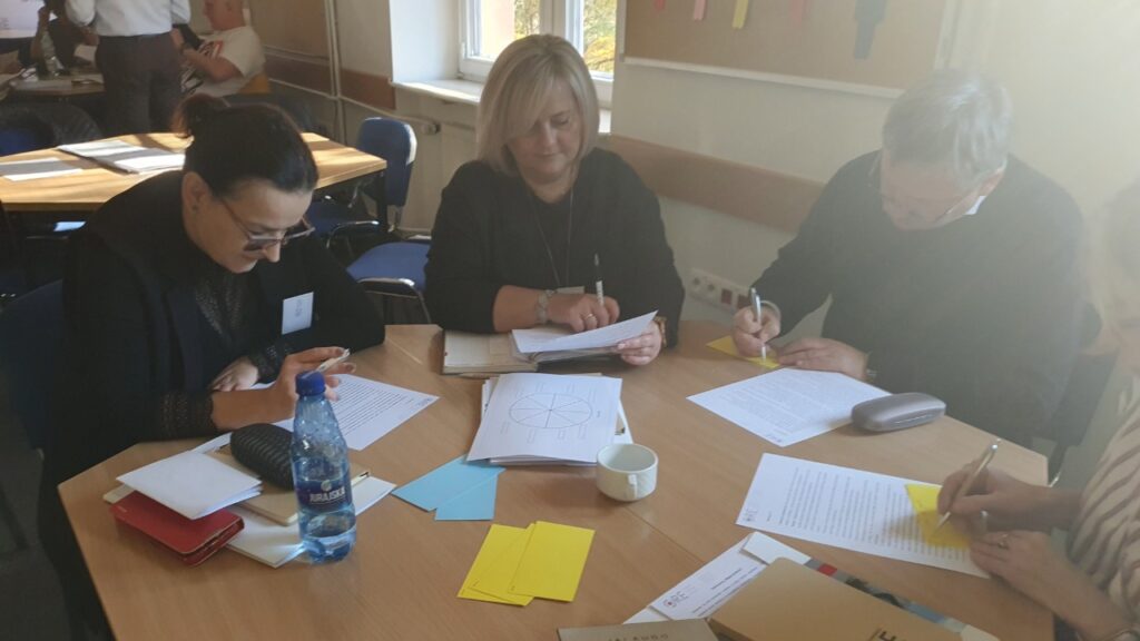 Drugiego dnia warsztatów uczestnicy ćwiczyli w grupach symulacje indywidualnej rozmowy doradczej. Wspólnie zastanawiali się, jak powinna przebiegać indywidualna rozmowa doradcza z konkretnym uczniem, którego przypadek – w formie case study – wylosowali. Dyskusje były ożywione, a pomysły bardzo kreatywne i zróżnicowane. Następnie każda grupa zaprezentowała wyniki swojej pracy i uzasadniła wypracowane rozwiązania. Pozostali uczestnicy warsztatów mogli podzielić się przemyśleniami i uwagami, jak podeszliby do rozmowy z danym uczniem.