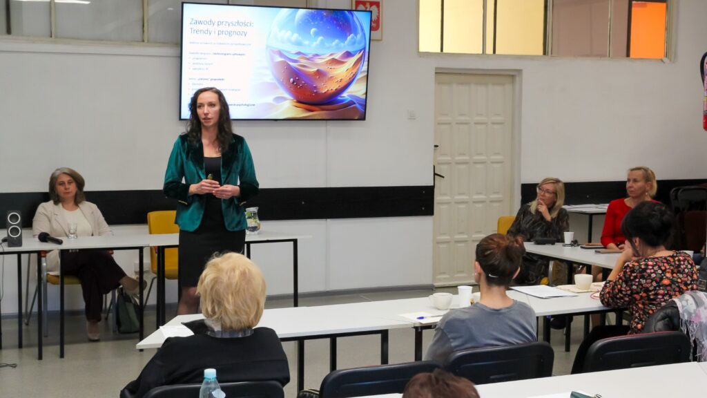 Prelegentka zaprezentowała najnowsze trendy na rynku pracy. Zwróciła uwagę na dynamiczny rozwój nowych technologii, digitalizację, globalizację oraz rosnące znaczenie sektora zielonej gospodarki, opieki zdrowotnej i zawodów kreatywnych. Wskazała, że przyszłe zawody będą wymagały elastyczności, ciągłego uczenia się, kompetencji społecznych oraz umiejętności pracy zespołowej i komunikacji międzykulturowej. Poruszyła także temat wspólnej roli nauczycieli i doradców w rozwijaniu tych kompetencji.
