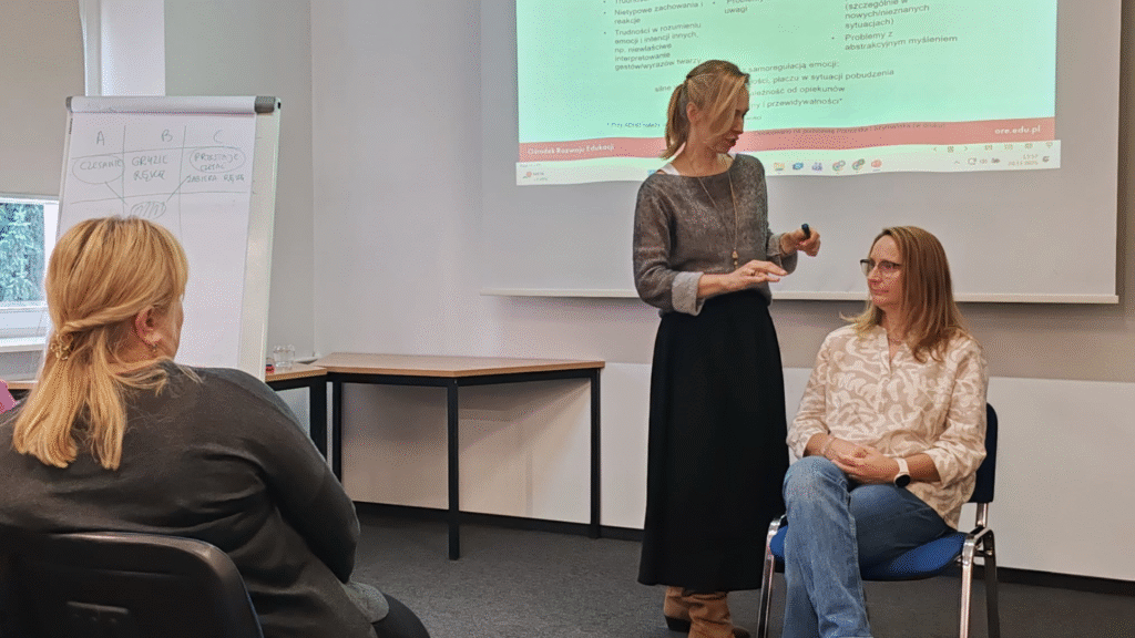 - zapoznanie uczestników ze sposobami pracy z uczniami przejawiającymi zachowania trudne, w tym z uczniami ze spektrum autyzmu oraz z niepełnosprawnością intelektualną – w szkole specjalnej;