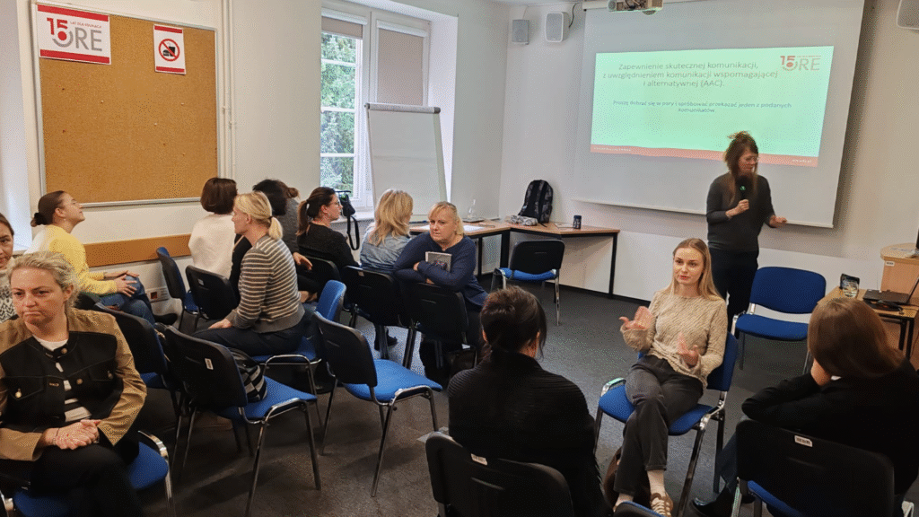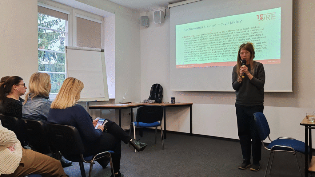 O tym, jak radzić sobie z zachowaniami problemowymi uczniów z niepełnosprawnością intelektualną, mówiła drugiego dnia szkolenia Katarzyna Cichocka-Segiet. Wykładowczyni podzieliła się z uczestnikami wiedzą – wynikającą z wieloletniej praktyki zawodowej – na temat: