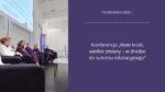 15 grudnia br. w Zielonej Górze odbyła się konferencja „Małe kroki, wielkie zmiany – w drodze do sukcesu edukacyjnego”. Spotkanie zorganizowane zostało przez Kuratorium Oświaty w Gorzowie Wielkopolskim. Sala konferencyjna w Parku Technologii Kosmicznych w Zielonej Górze zgromadziła blisko 400 osób.