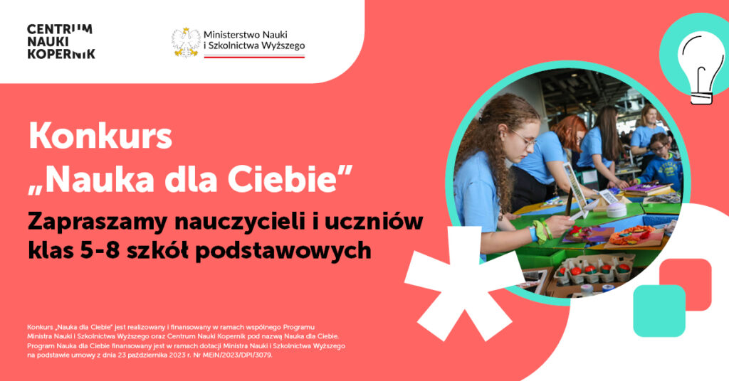 Centrum Nauki Kopernik zaprasza uczniów i nauczycieli szkół podstawowych do udziału w konkursie „Nauka dla Ciebie”, organizowanego przez Centrum Nauki Kopernik wspólnie z Ministerstwem Nauki i Szkolnictwa Wyższego w ramach programu „Nauka dla Ciebie”. Aby się zgłosić, wystarczy wypełnić formularz na stronie Centrum Nauki Kopernik.