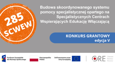 Ośrodek Rozwoju Edukacji w Warszawie ogłasza V edycję konkursu grantowego dotyczącego utworzenia Specjalistycznych Centrów Wspierających Edukację Włączającą (SCWEW). Konkurs jest prowadzony w ramach projektu „Budowa skoordynowanego systemu pomocy specjalistycznej opartego na Specjalistycznych Centrach Wspierających Edukację Włączającą”, współfinansowanego z Europejskiego Funduszu Społecznego Plus ze środków programu Fundusze Europejskie dla Rozwoju Społecznego 2021–2027.