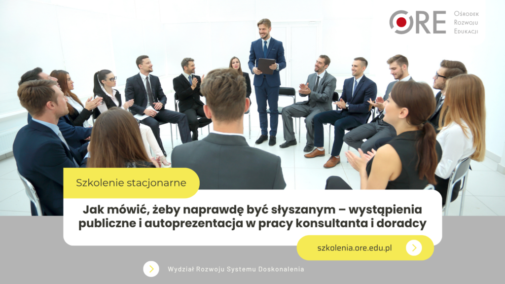Wydział Rozwoju Systemu Doskonalenia zaprasza nauczycieli konsultantów i doradców metodycznych, którzy rozpoczynają pracę w publicznych placówkach doskonalenia nauczycieli, do udziału w szkoleniu „Jak mówić, żeby naprawdę być słyszanym – wystąpienia publiczne i autoprezentacja w pracy konsultanta i doradcy”.