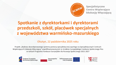Przedstawicielki Ośrodka Rozwoju Edukacji w Warszawie wzięły udział w naradzie dotyczącej projektu „Budowa skoordynowanego systemu pomocy specjalistycznej opartego na Specjalistycznych Centrach Wspierających Edukację Włączającą” zorganizowanej przez Kuratorium Oświaty w Olsztynie 22 października br. W spotkaniu uczestniczyli – prowadząca naradę Agnieszka Szczeszak, zastępca dyrektora Wydziału Nadzoru Pedagogicznego Kuratorium Oświaty w Olsztynie, oraz dyrektorzy szkół i placówek kształcenia specjalnego z rejonu Olsztyna i okolicznych powiatów. Jolanta Nawrocka, ekspertka […]