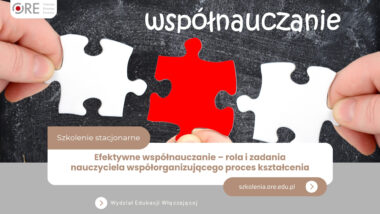 Dyrekcja Ośrodka Rozwoju Edukacji w Warszawie oraz pracownicy Wydziału Edukacji Włączającej zapraszają nauczycieli współorganizujących proces kształcenia, nauczycieli przedmiotów oraz wychowawców pracujących w szkołach podstawowych na dwudniowe szkolenie stacjonarne „Efektywne współnauczanie – rola i zadania nauczyciela współorganizującego proces kształcenia”. Szkolenie odbędzie się 27–28 kwietnia br. w Centrum Szkoleniowym ORE w Sulejówku. Program szkolenia obejmuje wykłady interaktywne, których celem jest pogłębienie wiedzy na temat prawnych podstaw pracy nauczyciela współorganizującego […]