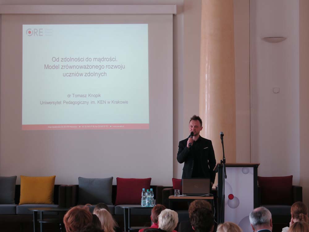 Wykład „Od zdolności do mądrości – model zrównoważonego rozwoju uczniów zdolnych” wygłosił dr Tomasz Knopik (Uniwersytet Pedagogiczny im. KEN w Krakowie). W swoim wystąpieniu zaproponował następujące rozumienie zrównoważonego rozwoju: synchroniczny rozwój sfery motorycznej i poznawczej, synchroniczny rozwój sfery poznawczej i emocjonalno-społecznej, synchroniczny rozwój sfery intra- i interpersonalnej. Podał również propozycje ćwiczeń wykorzystywanych w treningu mądrości.